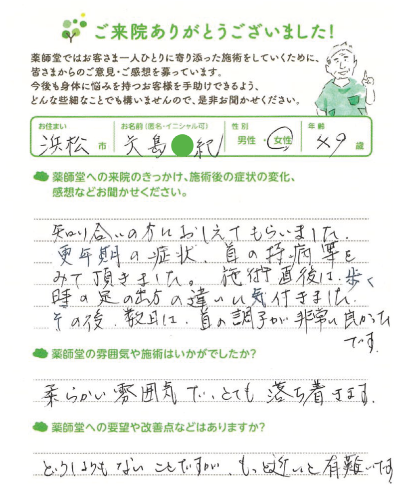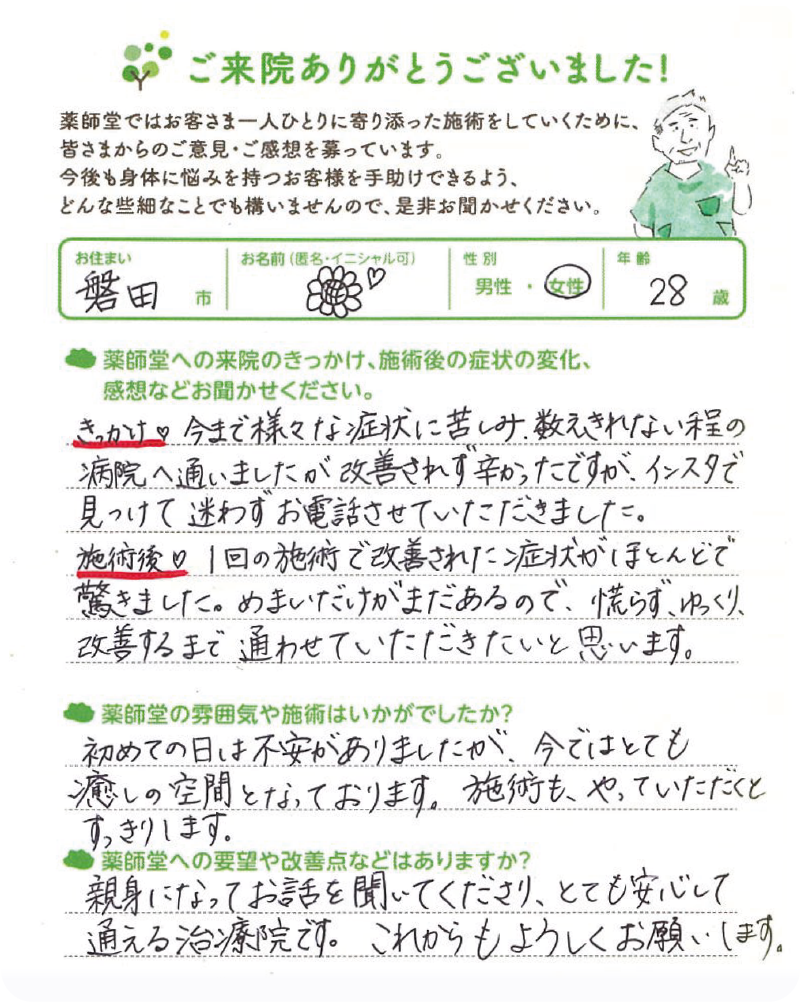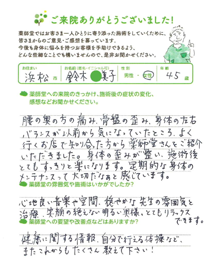 腰の奥の方の痛み、骨盤の歪み、身体の左右のバランスが以前から気になっていたところ、よく行くお店で知り合った方から薬師堂さんをご紹介いただきました。身体の歪みが整い、施術後とてもすっきりと楽になります。定期的な身体のメンテナンスって大切だなぁと感じています。雰囲気は心地よい音楽や空間、穏やかな先生の雰囲気と治療、笑顔の絶えない明るい奥様にとてもリラックスできます。健康に関する情報、自分で行える体操など、またこれからもたくさん教えてください!(40代・女性)
