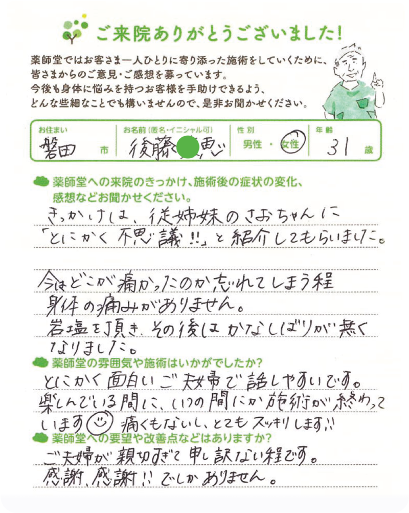 きっかけは従姉妹のさおちゃんに「とにかく不思議!!」と紹介してもらいました。今はどこが痛かったのか忘れてしまう程、身体の痛みがありません。岩塩を頂き、その後はかなしばりがなくなりました。とにかく面白いご夫婦で話しやすいです。楽しんでいる間に、いつの間にか施術が終わっています。痛くもないし、とてもスッキリします!!ご夫婦が親切すぎて申し訳ない程です。感謝、感謝!!でしかありません。(30代・女性)