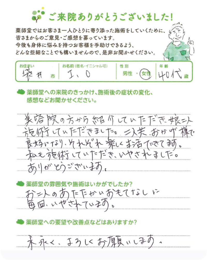 美容院の方から紹介していただき、娘二人に施術していただきました。二人共おかげ様で良好になり、それぞれ楽しく生活できています。私も施術していただき癒されました。ありがとうございます。お二人のあたたかいおもてなしに毎回癒されています。末永くよろしくお願いします。(40代・女性)