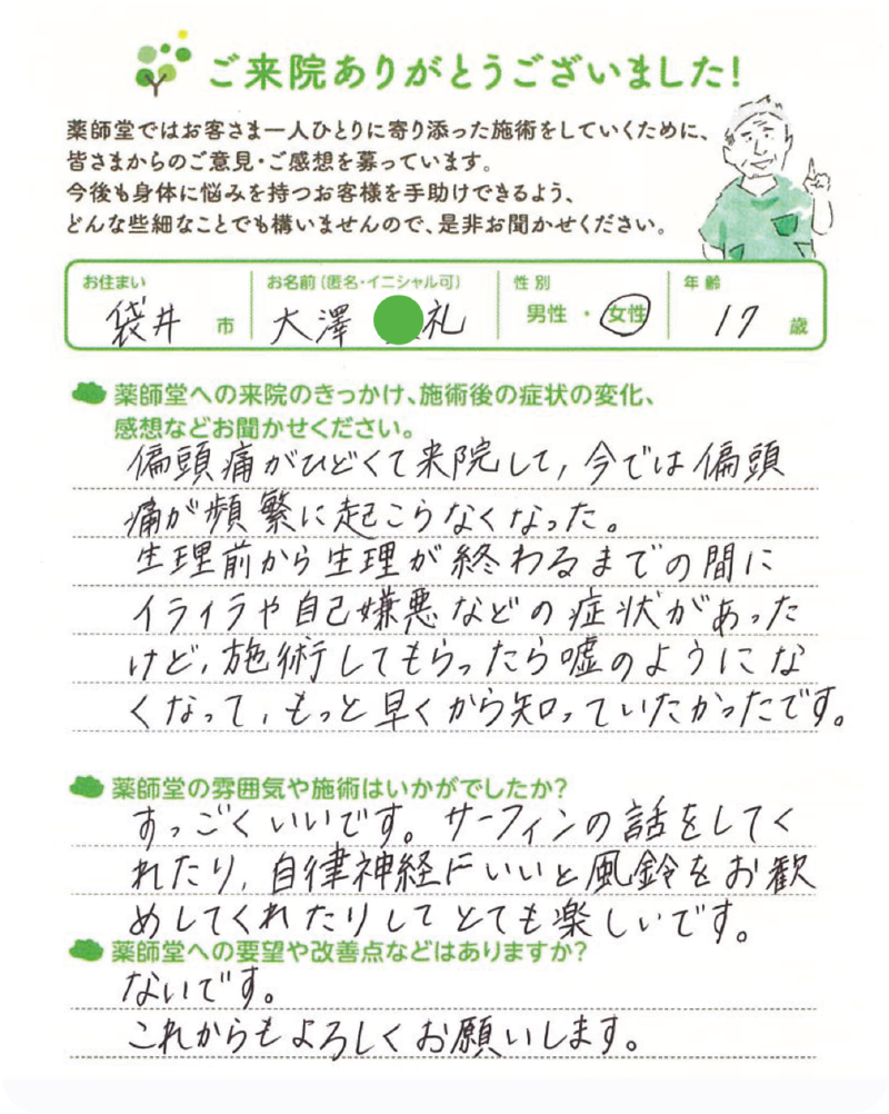 偏頭痛がひどくて来院して、今では偏頭痛が頻繁に起こらなくなりました。生理前から生理が終わるまでの間にイライラや自己嫌悪などの症状があったけど、施術してもらったら嘘のようになくなって、もっと早くから知っていたかったです。雰囲気はすっごくいいです。サーフィンの話をしてくれたり、自律神経にいいと風鈴をお勧めしてくれたりしてとても楽しいです。これからもよろしくお願いします。(10代・女性)