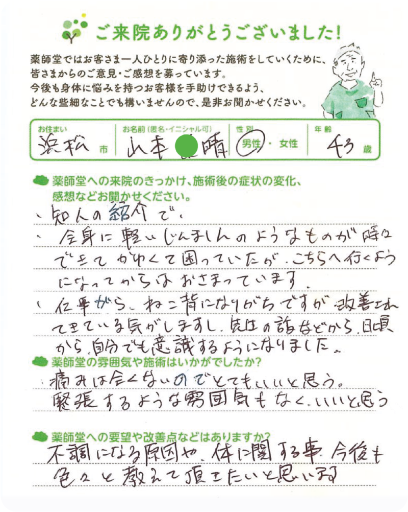全身にじんましんのようなものが時々できて痒くて困っていたが、こちらに行くようになってからはおさまっています。仕事柄、猫背になりがちですが改善できている気がします。先生の話などから日頃から自分でも意識するようになりました。施術は痛みが全くないのでとてもいいと思います。雰囲気は、緊張するような雰囲気もありません。不調になる原因や体に関する事、今後も教えていただきたいと思います。(40代・男性)