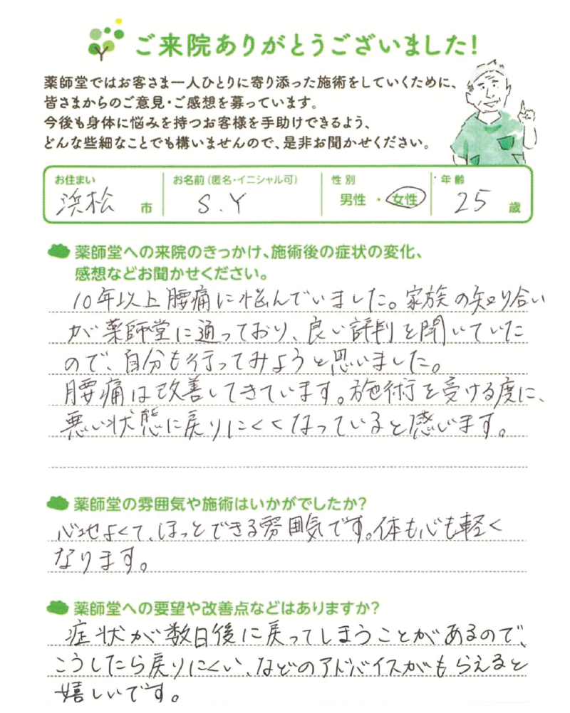 10年以上腰痛に悩んでいました。家族の知り合いが薬師堂に通っており、良い評判と聞いていたので自分でも行ってみようと思いました。腰痛は改善してきています。施術を受ける度に、悪い状態に戻りにくくなっていると感じます。雰囲気は、心地よくて、ほっとできます。体も心も軽くなります。症状が数日後に戻ってしまうことがあるので、こうしたら戻りにくいなどのアドバイスがもらえると嬉しいです。(20代・女性)