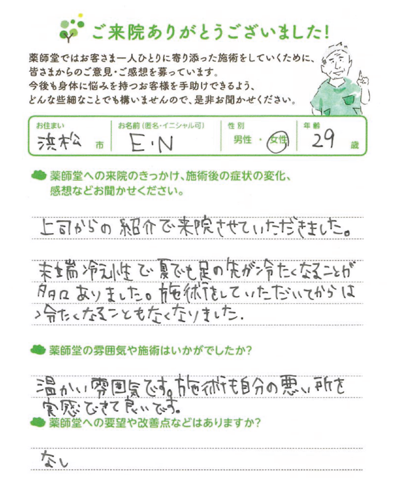 上司からの紹介で来院させていただきました。末端冷え性で夏でも足の先が冷たくなることが多々ありました。施術をしていただいてからは冷たくなることもなくなりました。雰囲気が温かく、施術も自分の悪い所を実感できて良いです。(40代・女性)