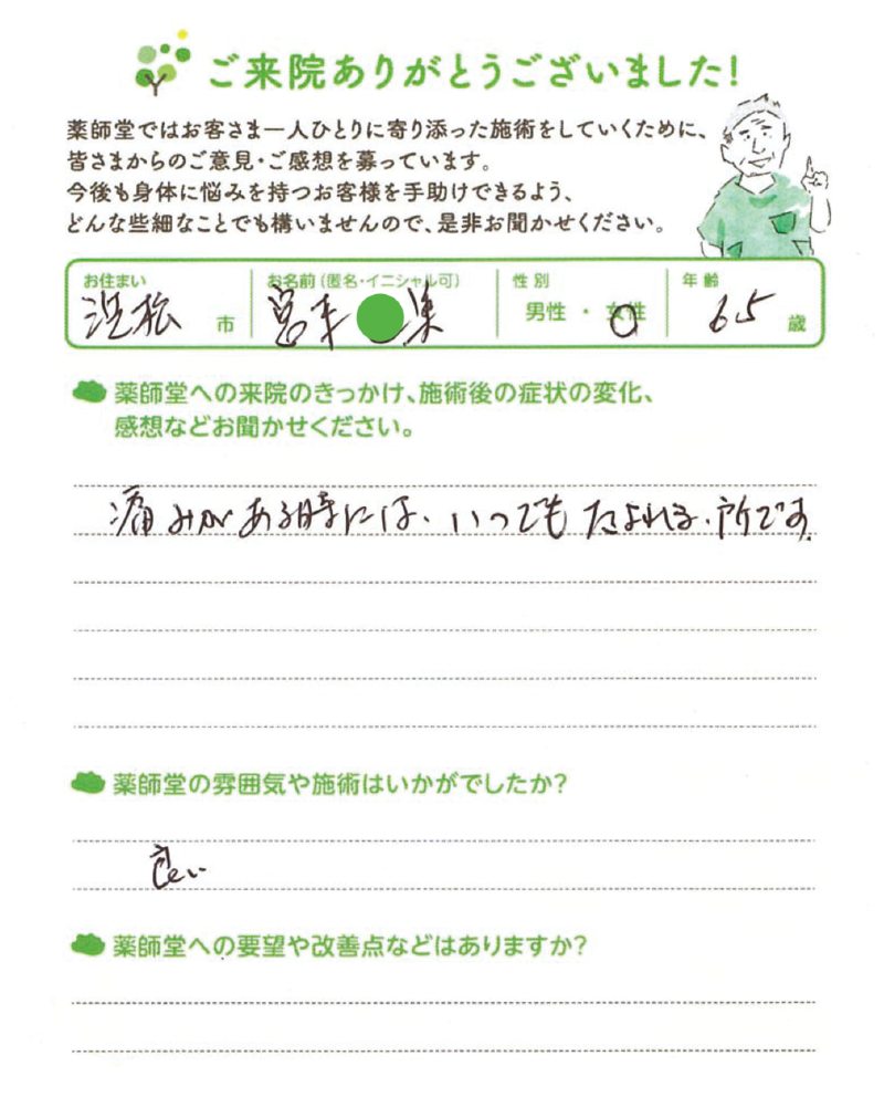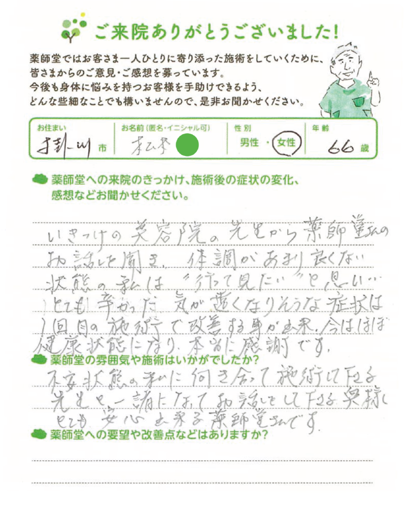 いきつけの美容院の先生から薬師堂さんのお話を聞き、体調があまり良くない状態の私は「行ってみたい」と思い、とても辛かった気が遠くなりそうな症状は1回目の施術で改善することが出来、今はほぼ健康状態になりました。本当に感謝です。不安状態の私に向き合って施術してくださる先生と一緒になってお話をして下さる奥様。とても安心出来る薬師堂さんです。(60代・女性)