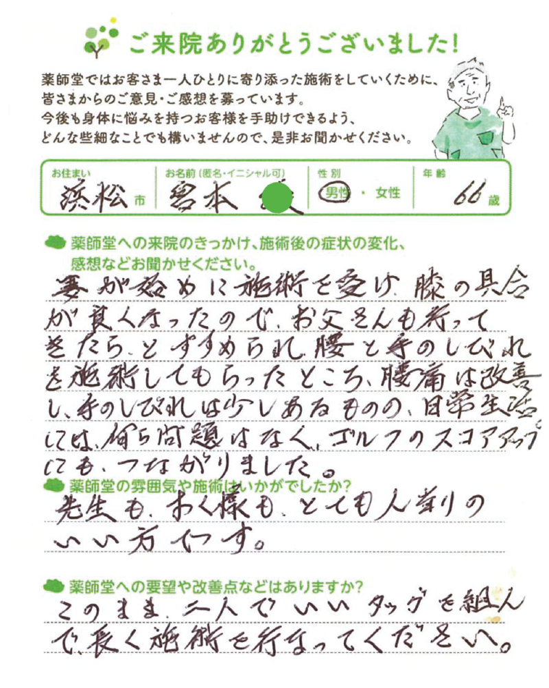妻がはじめに施術を受け、膝の具合が良くなったのでお父さんも行ってきたら、と勧められて腰と手のしびれを施術してもらったところ、腰痛は改善し、手のしびれは少しあるものの、日常生活には何ら問題はなく、ゴルフのスコアアップにもつながりました。雰囲気は、先生も奥様もとても人当たりのいい方です。このまま二人でいいタッグを組んで長く施術を行ってください。(60代・男性)