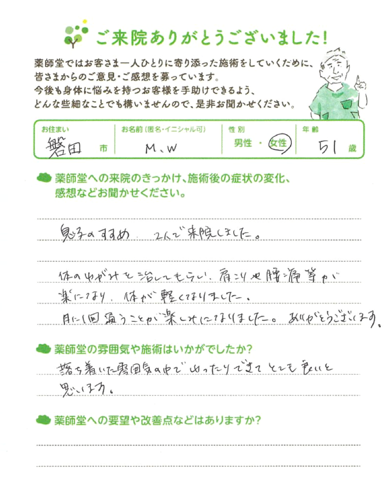 息子のすすめで2人で来院しました。体の歪みを直してもらい、肩こりや腰痛等が楽になり、体が軽くなりました。月に1回通うことが楽しみになりました。ありがとうございます。落ち着いた雰囲気の中でゆったりできてとても良いと思います。(50代・女性)