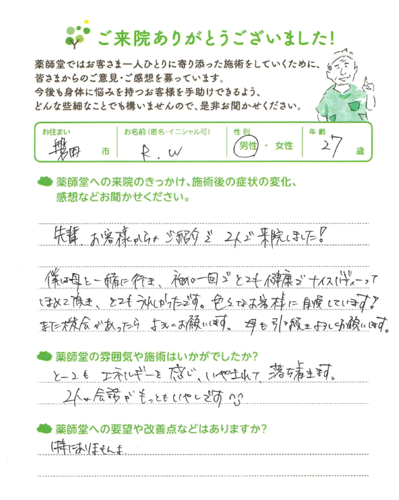 先輩、お客様からのご紹介で2人で来院しました!僕は母と一緒に行き、初めの1回でとても健康でナイスバディーって褒めて頂き、とても嬉しかったです。色々なお客様に自慢しています!また機会があったらよろしくお願いします。母も引き続きよろしくお願いします。雰囲気はとーってもエネルギーを感じ、癒されて落ちつきます。2人の会話がもっとも癒しです^^(20代・男性)