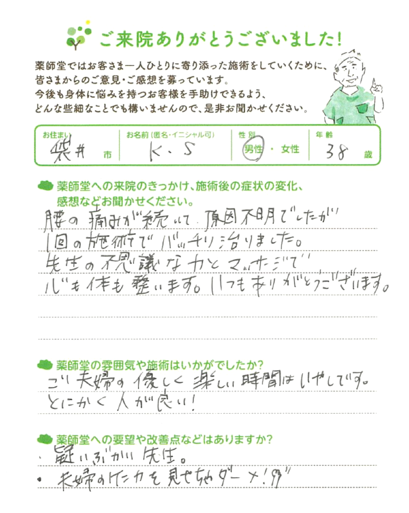 腰の痛みが続いて原因不明でしたが1回の施術でバッチリ治りました。先生の不思議な力とマッサージで心も体も整います。いつもありがとうございます。ご夫婦の優しく楽しい時間は癒しです。とにかく人が良い!(30代・男性)