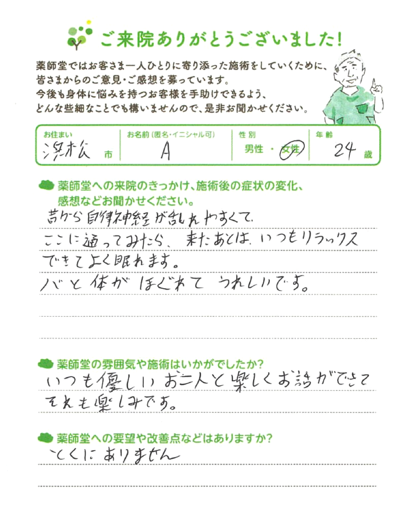 昔から自律神経が乱れやすく、ここに通ってみたら、来た後はいつもリラックスできてよく眠れます。心と体がほぐれて嬉しいです。いつも優しいお二人と楽しくお話ができてそれも楽しみです。(20代・女性)