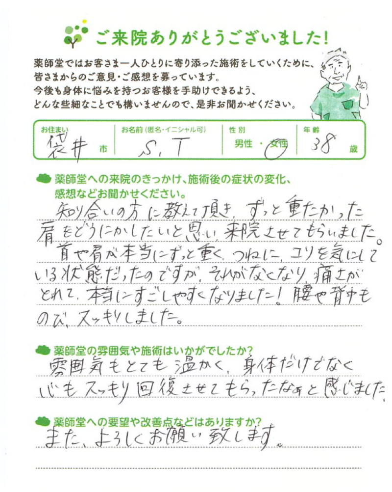 知り合いの方に教えて頂き、ずっと重たかった肩をどうにかしたいと思い、来院させてもらいました。首や肩が本当にずっと重く、常にコリを気にしている状態だったのですが、それがなくなり、痛さがとれて本当に過ごしやすくなりました!腰や背中ものび、スッキリしました。雰囲気もとても温かく、身体だけでなく心もスッキリ回復させてもらったなぁと感じました。また、よろしくお願い致します。(30代・女性)