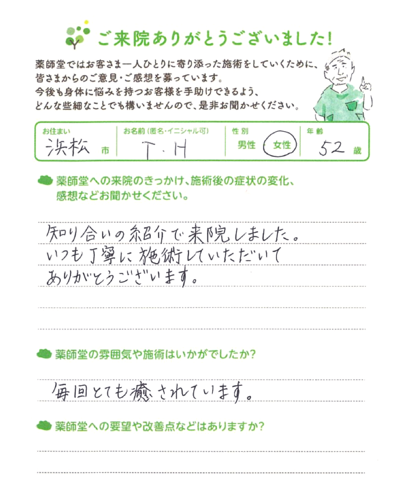 知り合いの紹介で来院しました。いつも丁寧に施術していただいてありがとうございます。毎回とても癒されています。(50代・女性)